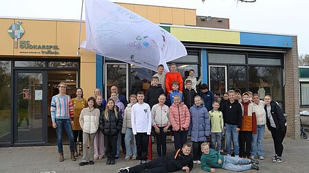 Kinderen uit groep 8 van IKC Oudkarspel kleurden een klimaatvlag met een krachtige duurzame boodschap. Tijdens de start van de Nationale Klimaatweek onthulde de klas hun kunstwerk en kreeg de enorme vlag maandag 10 november een plek aan de gevel van school.