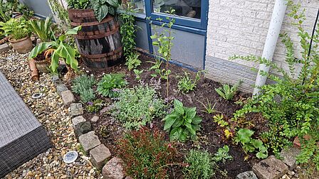 In 2025 wipte Remco Burger uit Heerhugowaard heel wat tegels uit zijn tuin en won een gouden gieter met een tuinbon. Van een deel van die tegels maakte hij een border die nu vol staat met inheemse planten. “De planten hebben de winter overleefd en doen het nu hartstikke goed”, vertelt Remco. “Ook voor mijn vijver kocht ik planten van de tuinbon en daar komt steeds meer leven in. Stukje bij beetje maak ik mijn tuin steeds groener en diervriendelijker. Mijn volgende project is een stukje verwilderde tuin voor egels. Daar plant ik een appelboom en plaats ik egelhuisjes die ik zelf maak met de gratis plattegrond van de egelbescherming. Als dat klaar is wip ik weer wat tegels uit mijn tuin voor nog meer vergroening.”