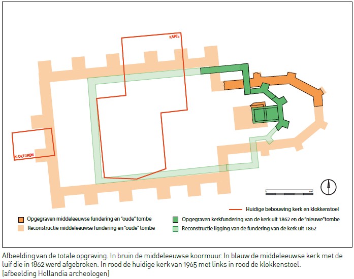 Bij de sloop van de kerk in 1965 deed de Rijksdienst voor het Oudheidkundig Bodemonderzoek een onderzoek. Men vond geen sporen van een oudere, middeleeuwse kerk. Wel bleek dat de fundering van de kerk uit 1862 nog volledig aanwezig was. Deze rustte op een verbrede uitmetseling, ongeveer één meter onder het oppervlak, op vast veen.