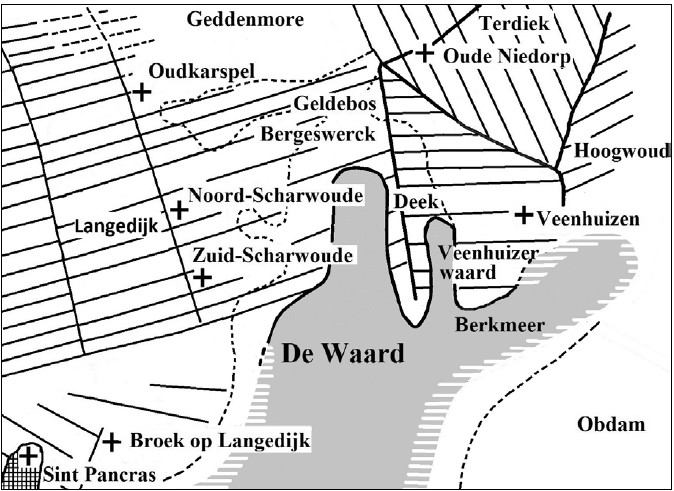 Ook aan de westkant ging veel land verloren. Het meer de Waard spoelde daar stukken land weg tussen Langedijk en de eilanden. Uiteindelijk bleven er alleen nog enkele eilanden over. Deze uitbreiding van het meer gebeurde waarschijnlijk tussen het jaar 1300 en 1400, en kostte Veenhuizen veel grond.